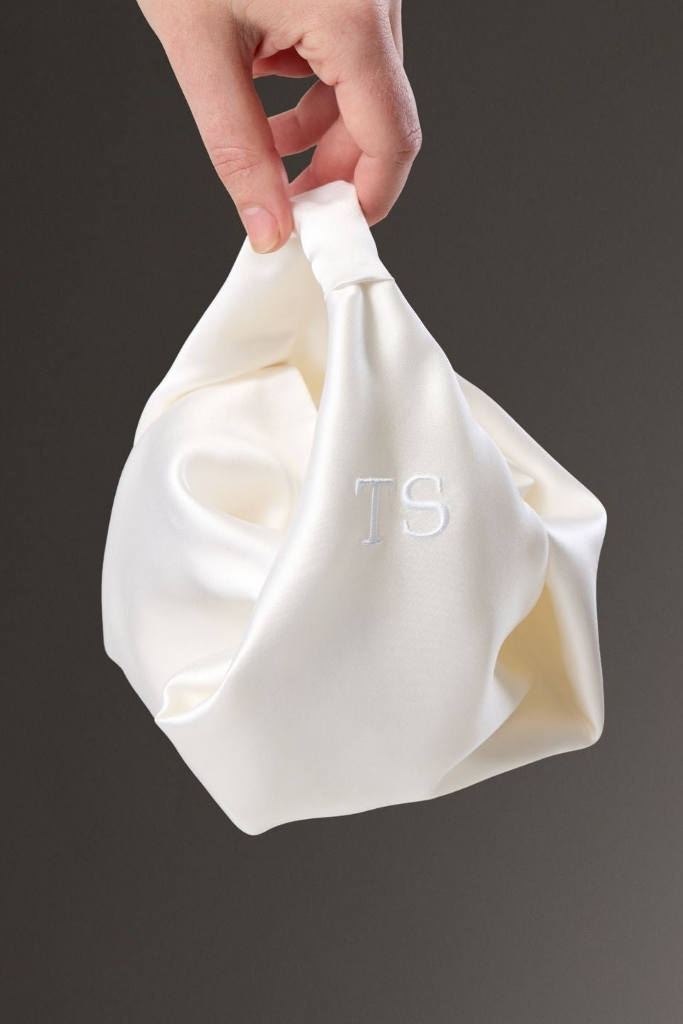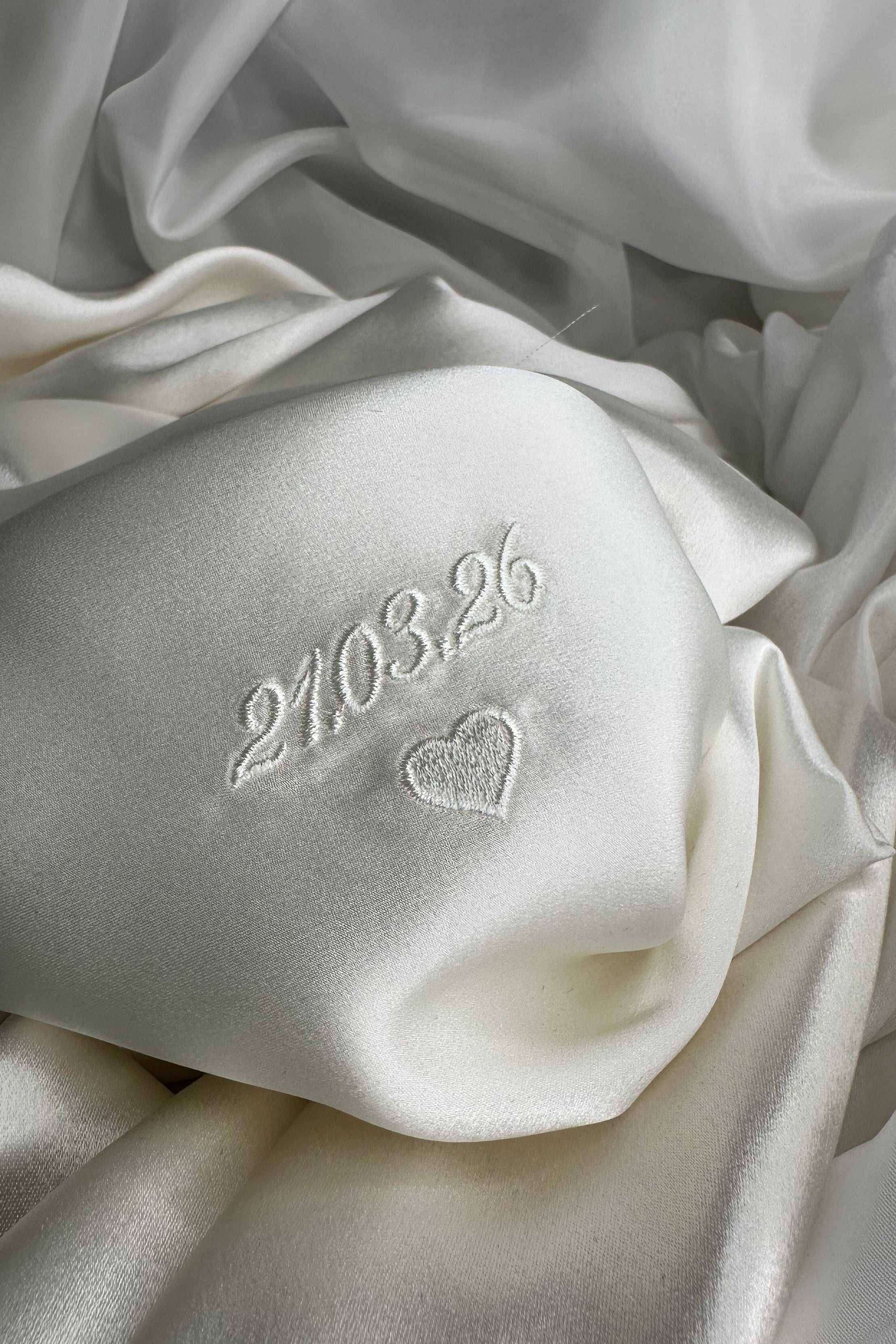 100% Silk Satin in Ivory, with 21.03.26 monogrammed in matching cursive script, approximately 1cm high, with a heart below the date.