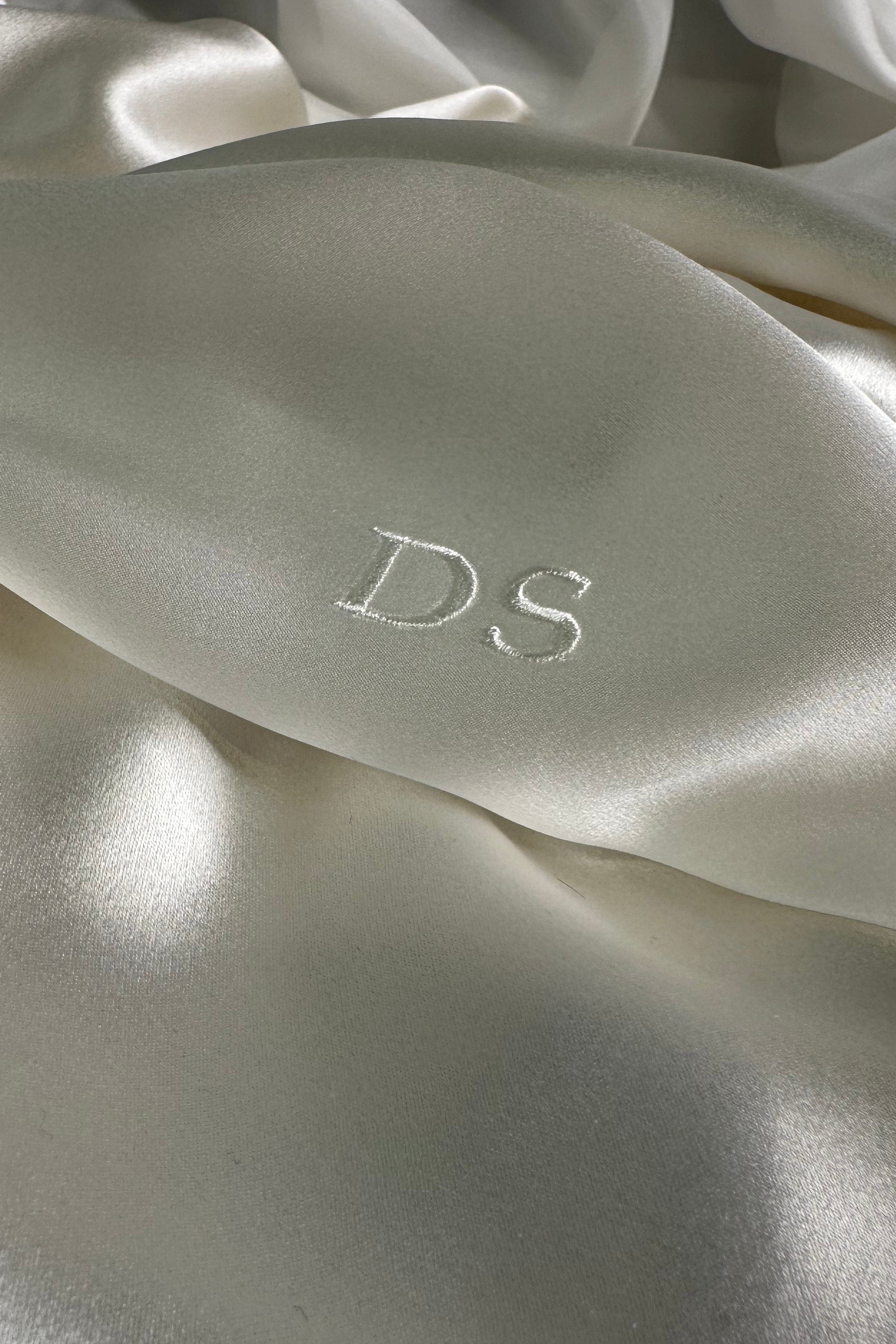 100% Silk Satin in Ivory, with DS monogrammed in matching capital initials, approximately 1.5cm high.