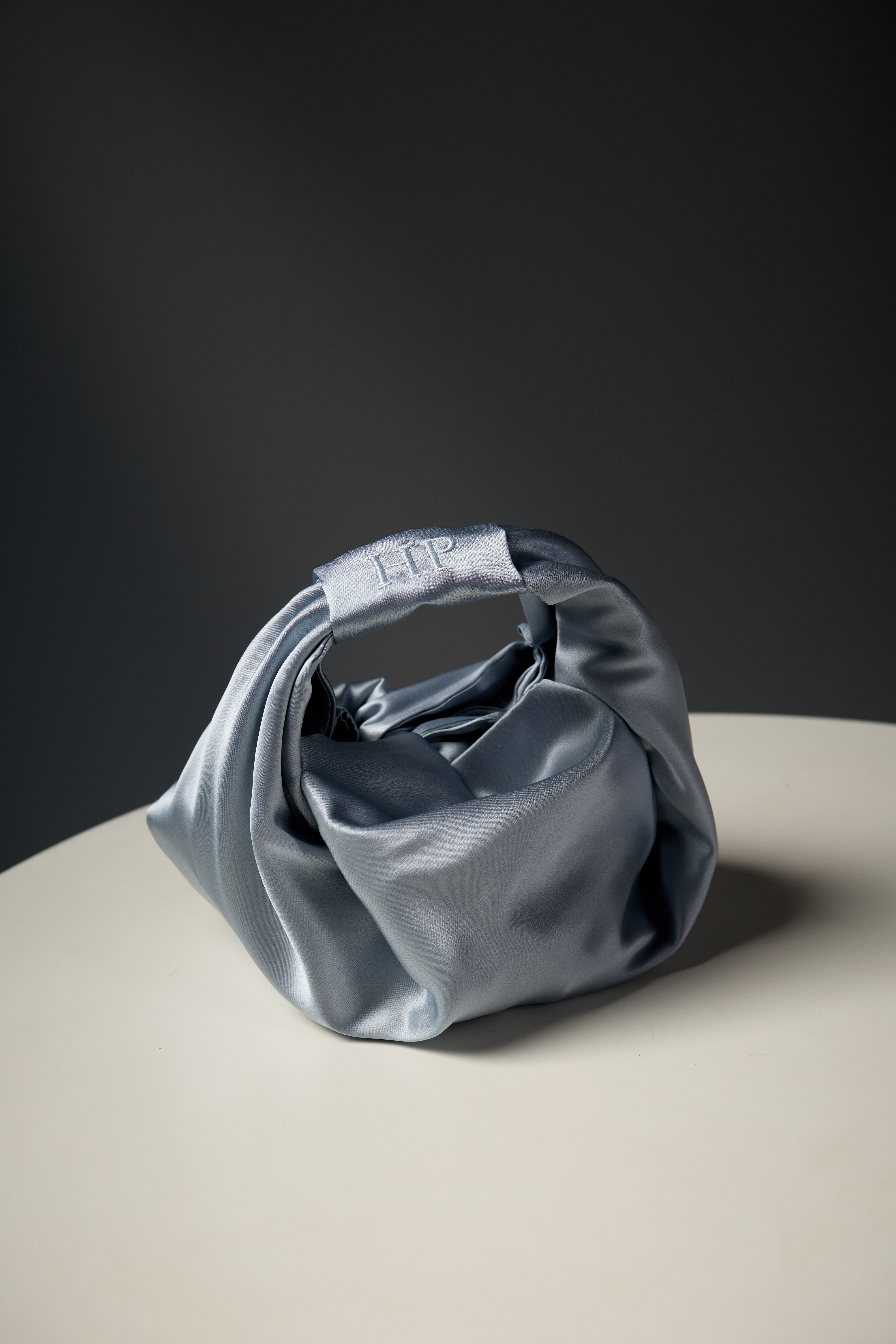 100% Silk Satin in Bluebell, with HP monogrammed on the handle in matching capital letters, approximately 1.5cm high.