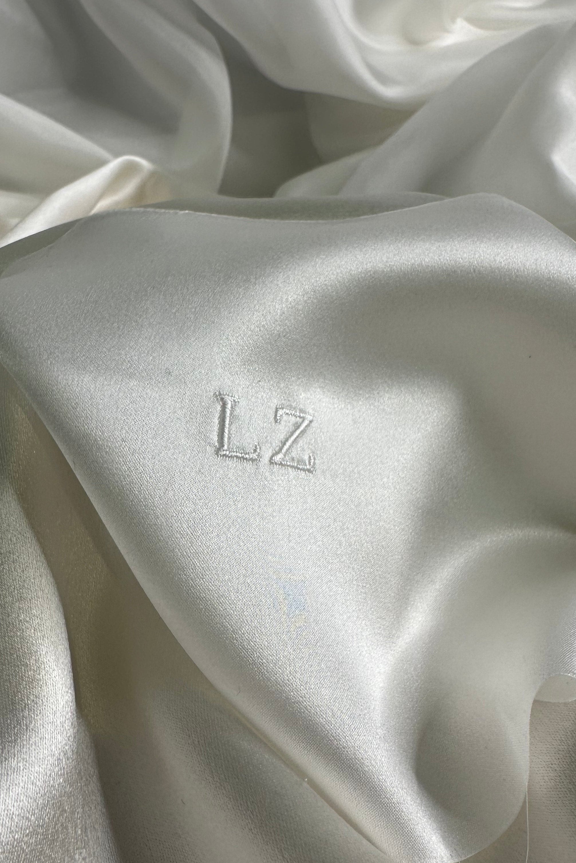 100% Silk Satin in White, with LZ monogrammed in matching capital letters, approximately 1cm high.