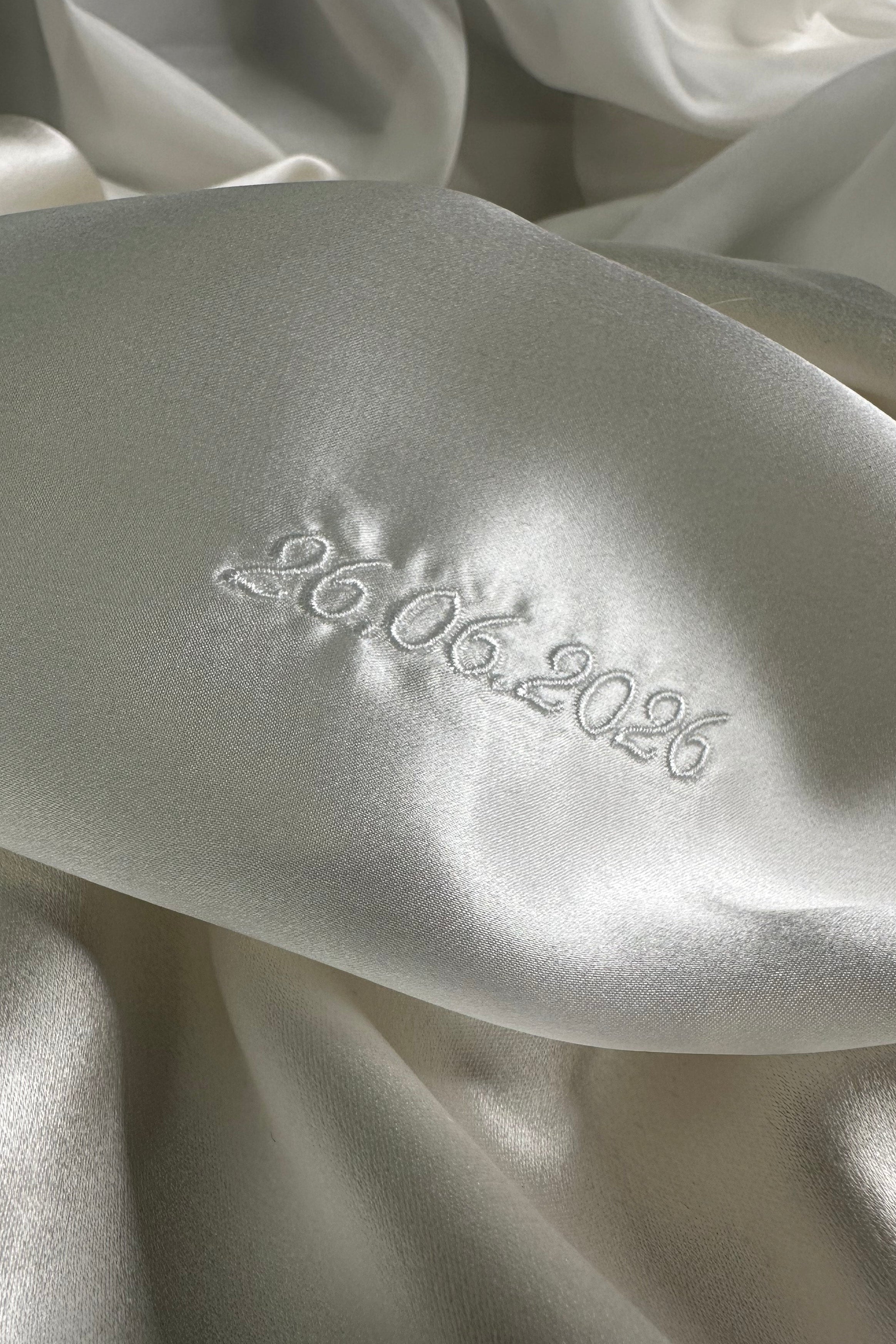 100% Silk Satin in White, with 26.06.2026 monogrammed in matching cursive script, approximately 1cm high.