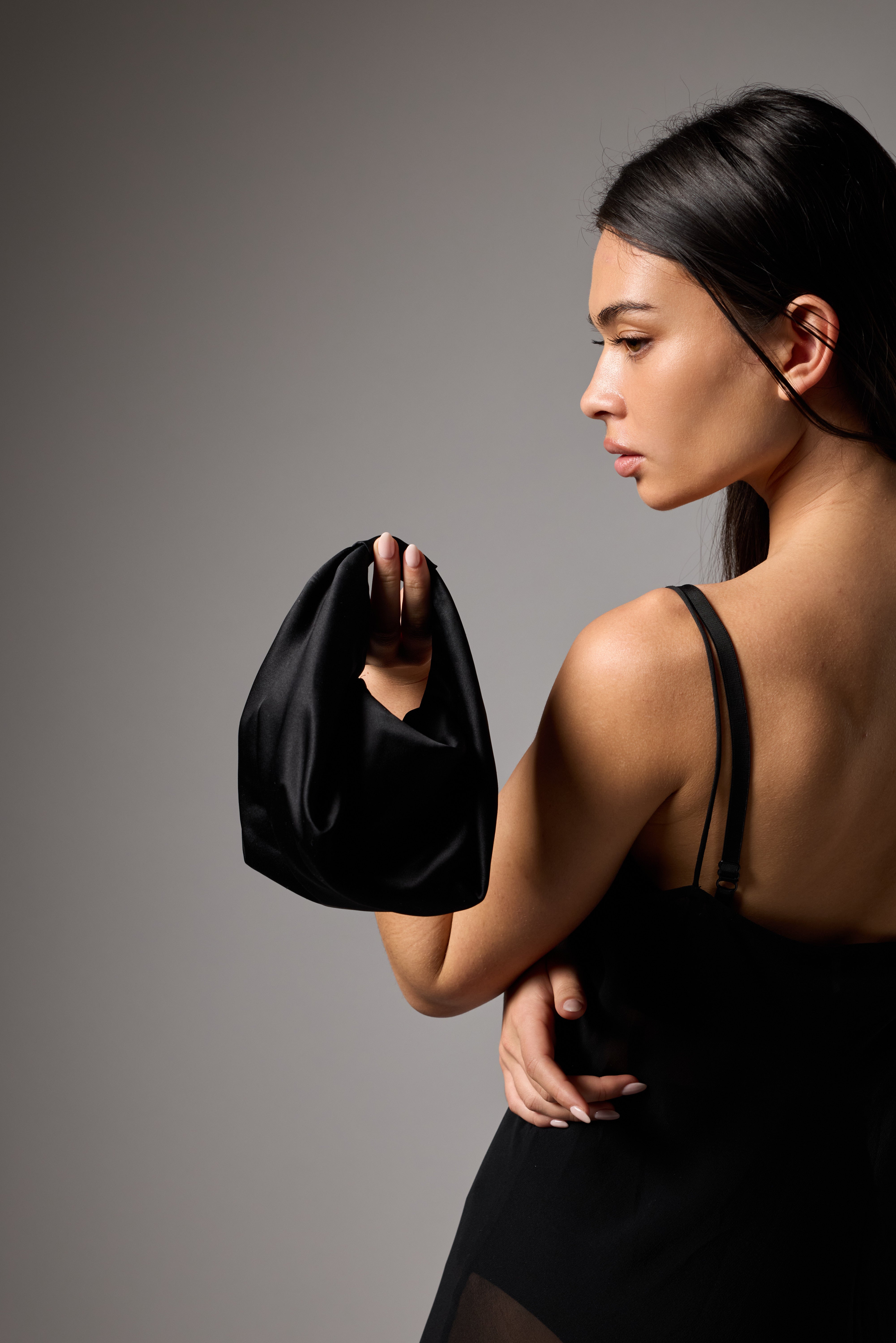 100% Silk Satin in Black, with NG monogrammed in matching cursive script, approximately 1.5cm high.