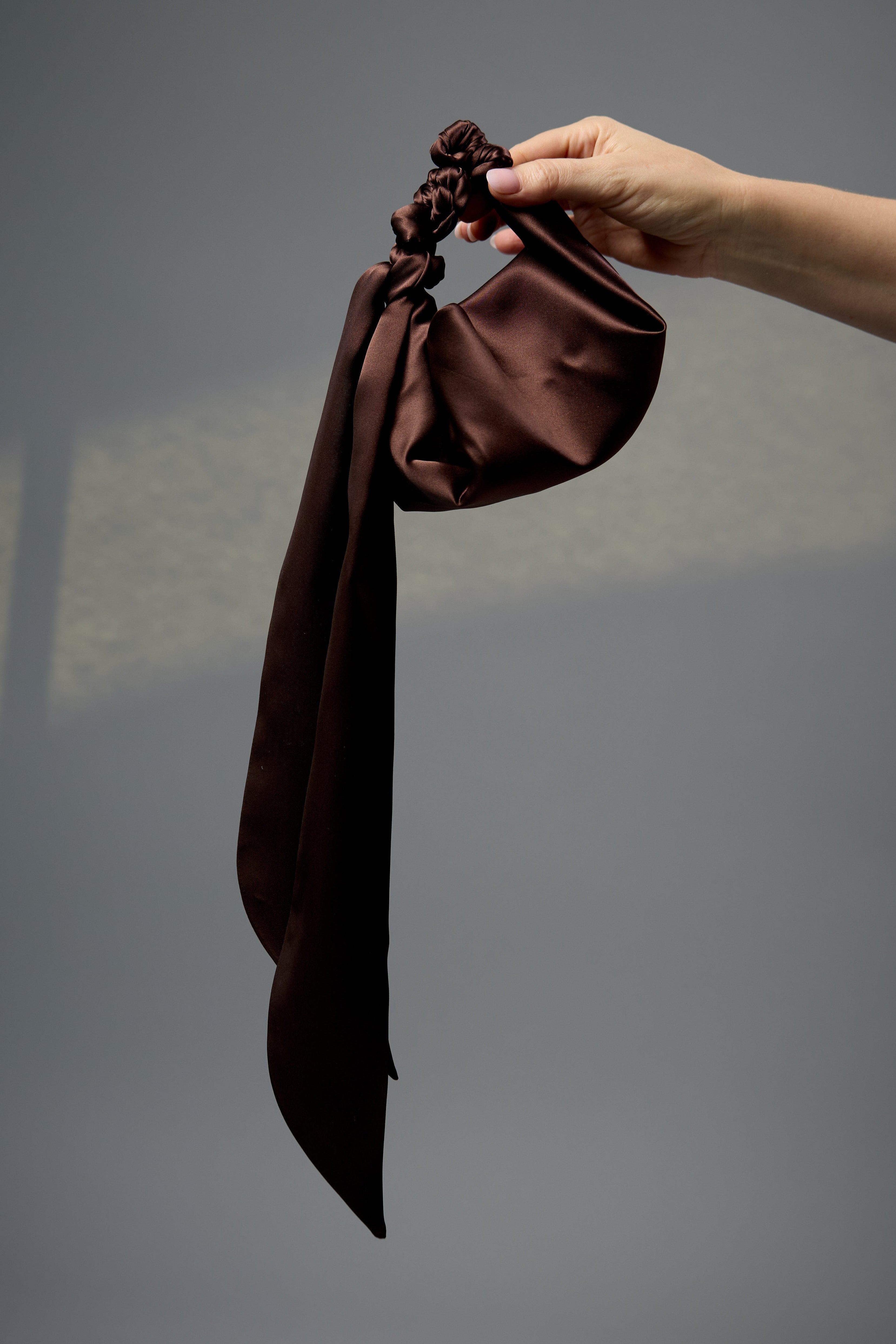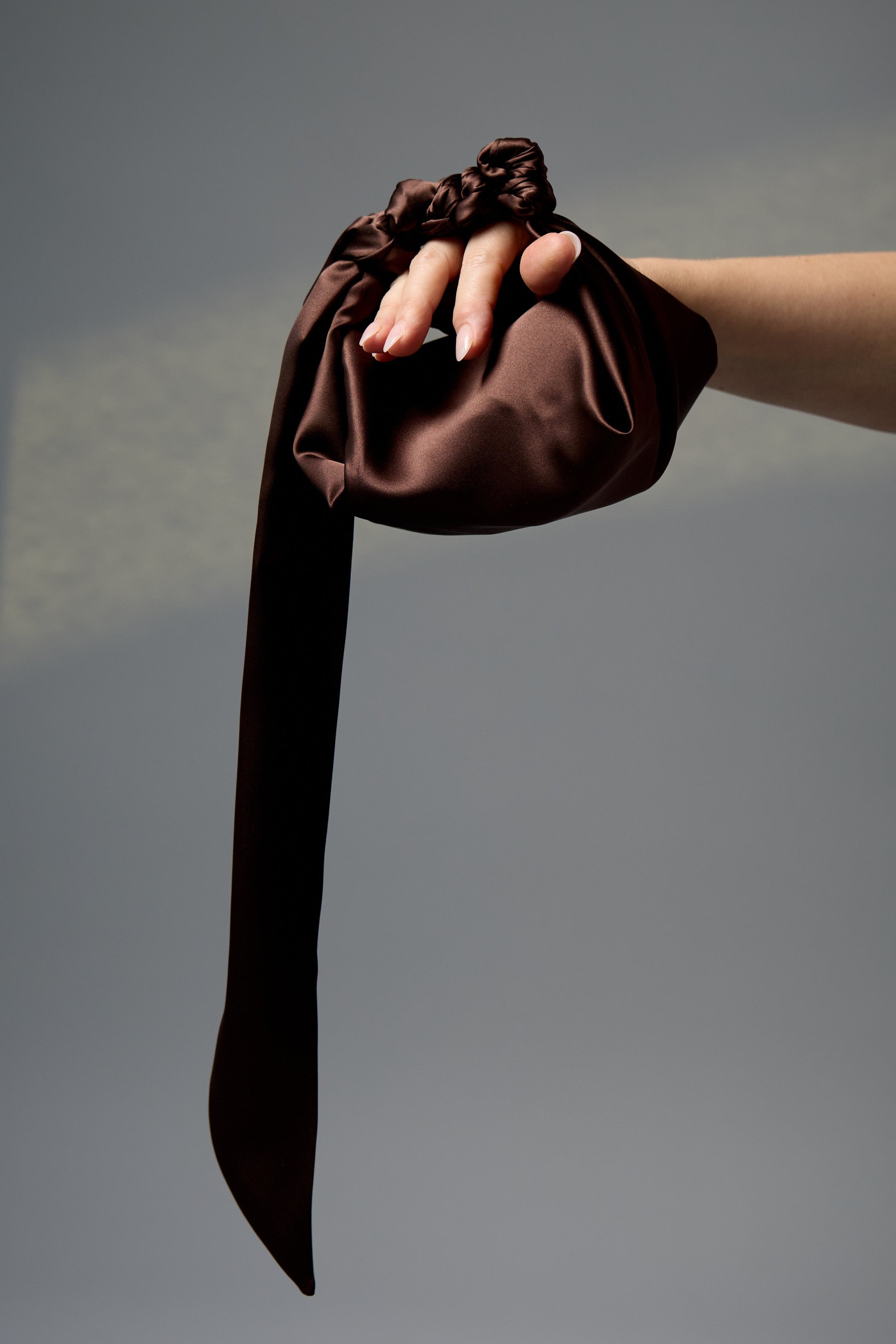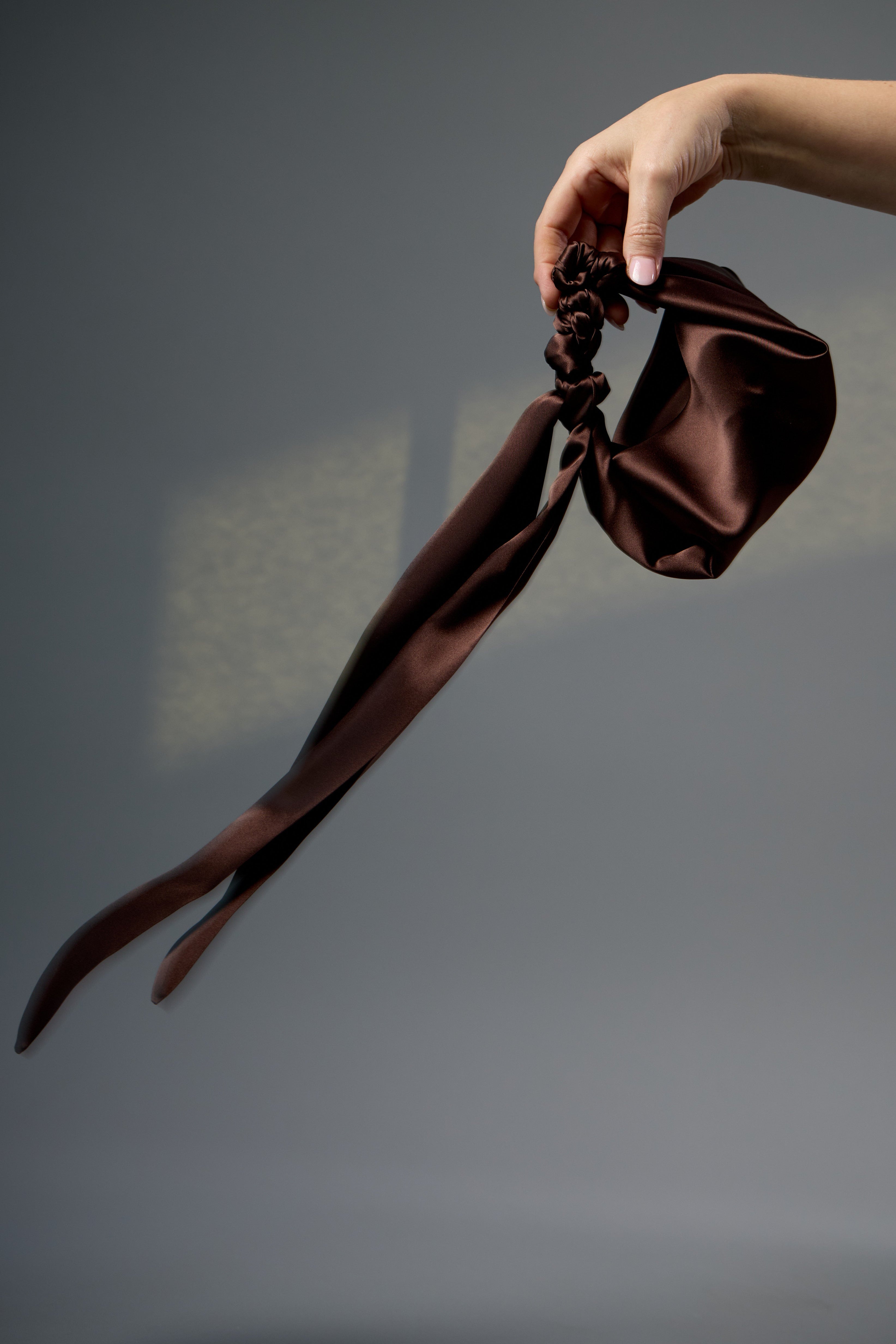 Colour & Fabrication: Crafted from a double layer of 100% Silk Satin in Dark Chocolate, with an internal double layer of 100% Raw Silk for structure.