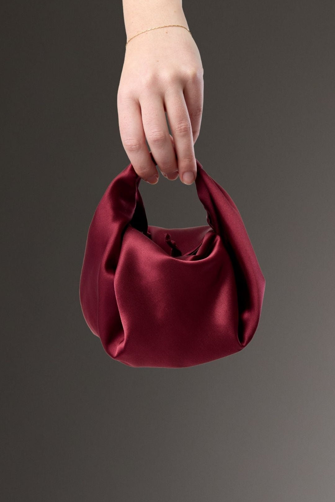 Detail: Crafted from a double layer of 100% Silk Satin in Port, with an internal double layer of 100% Raw Silk for structure. Internal self-tie straps secure the sides together if desired.