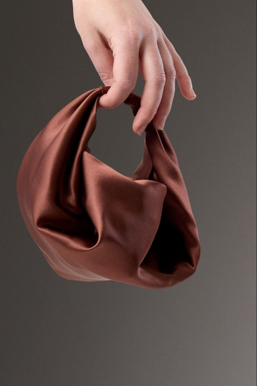 Detail: Crafted from a double layer of 100% Silk Satin in tobacco, with an internal double layer of 100% Raw Silk for structure.  Internal self-tie straps secure the sides together if desired.