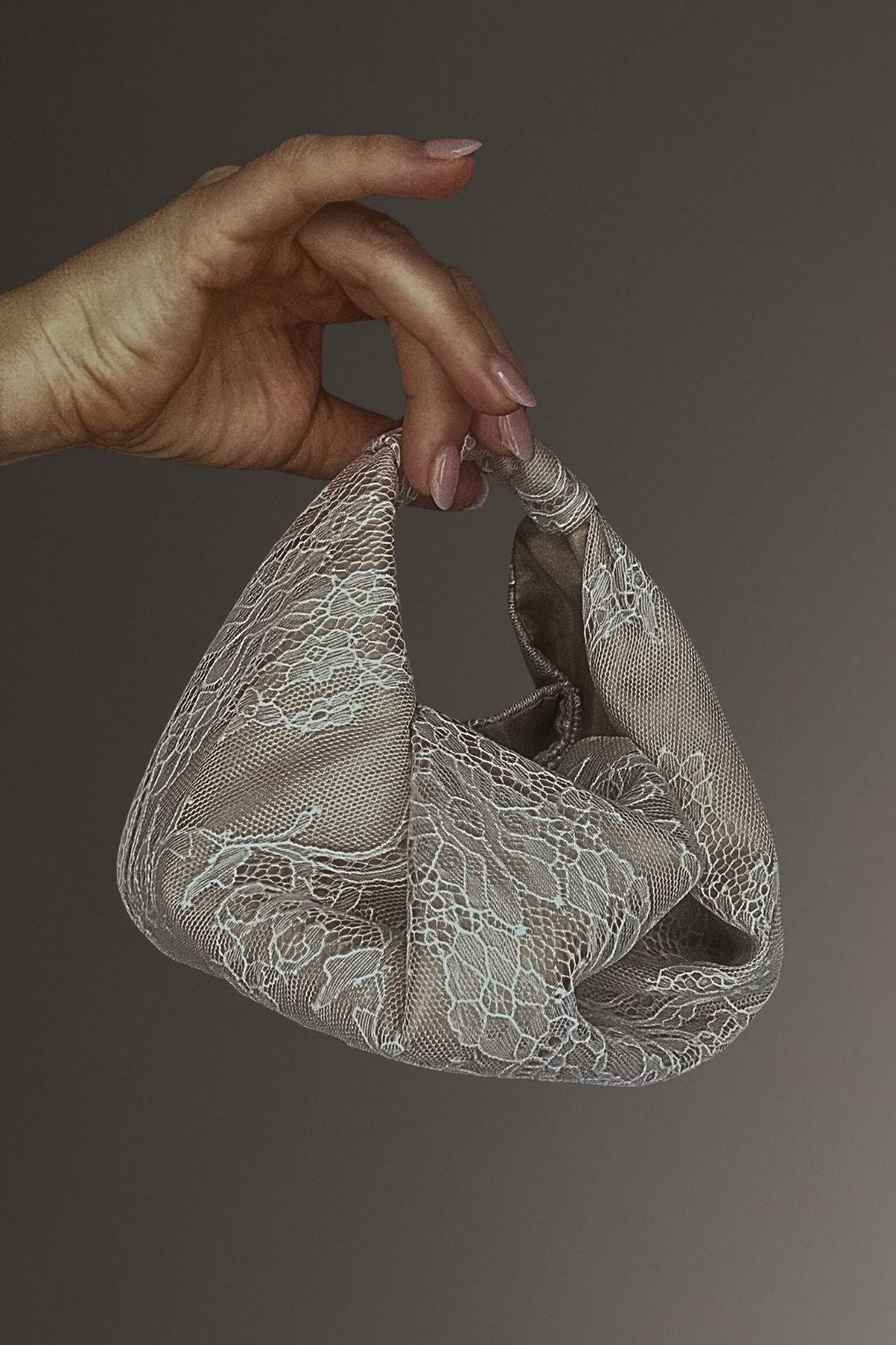 Made from a nude silk base, overlaid with delicate lace, this hand-held bag is the perfect accent to your outfit. The shape is created from folds of silk, which gives extra dimension and texture to the bag.