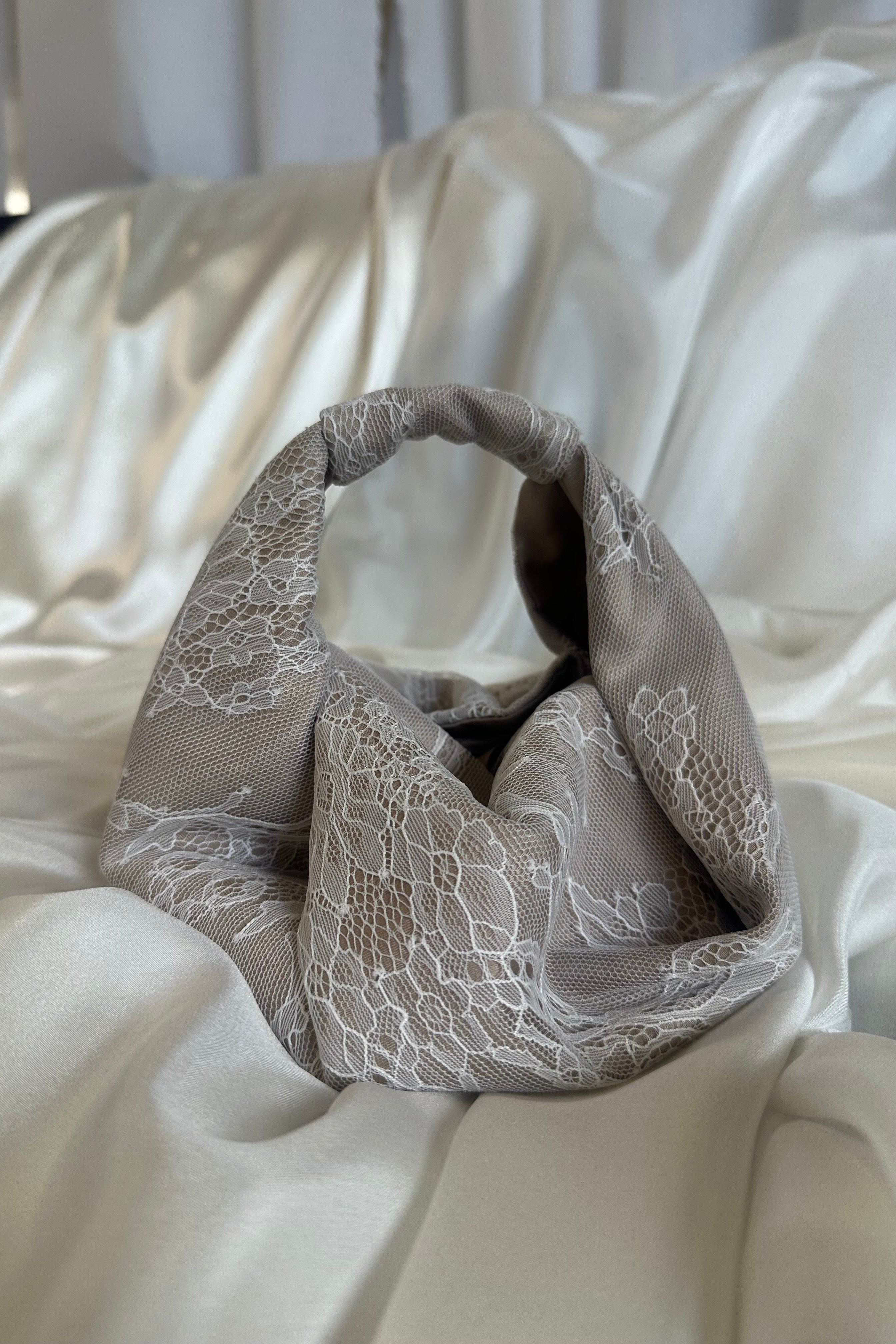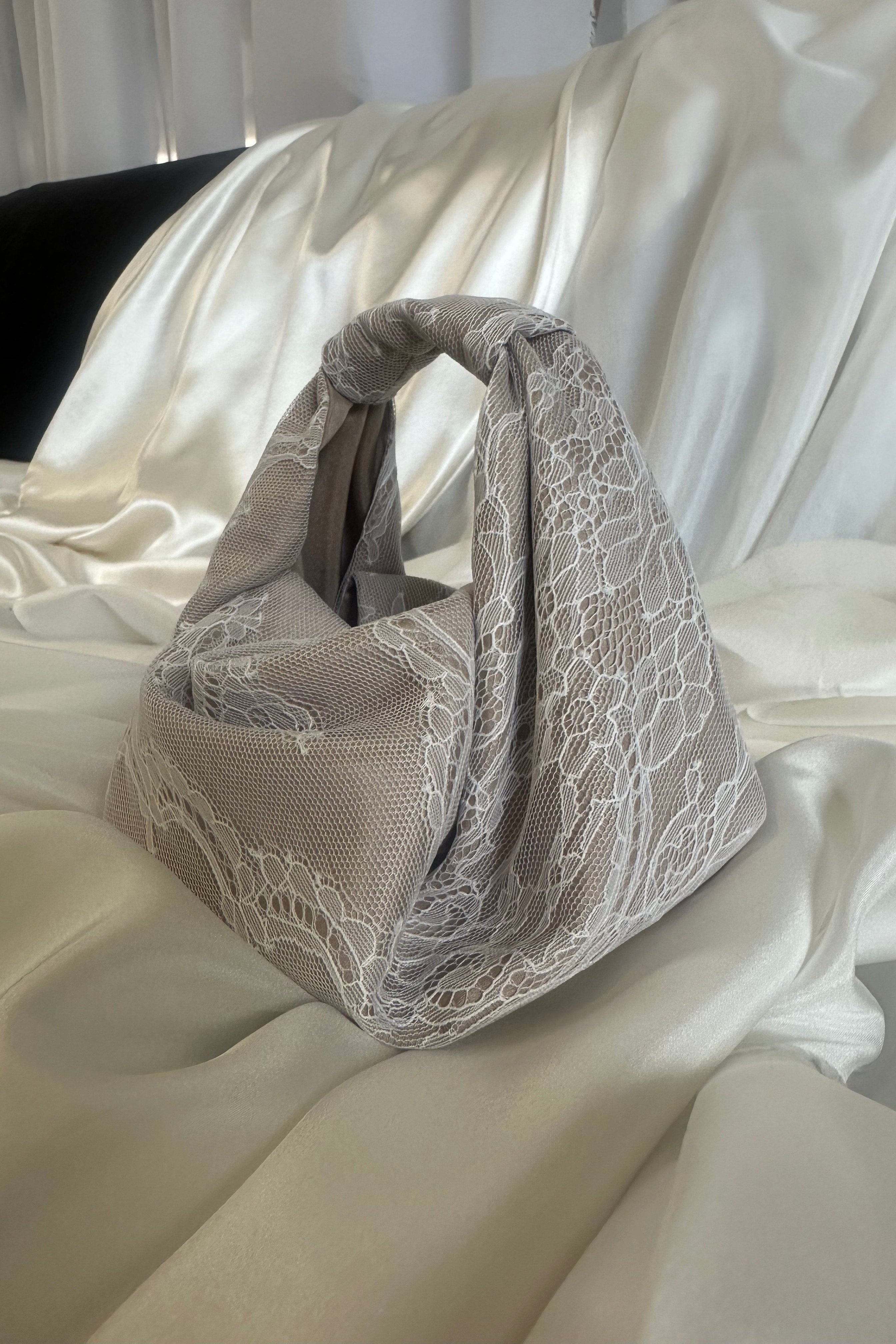 Detail: Crafted from a beautiful delicate lace in white over a base of nude 100% Silk Habotai. Internal layers of 100% Raw Silk give the bag structure. Internal self-tie straps secure the sides together if desired.